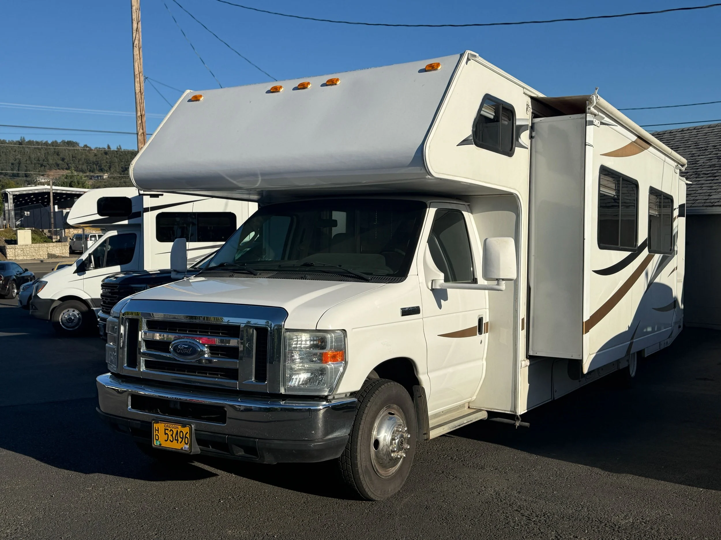 30 Foot, Closed in Bedroom in the rear, Large Wrap Around Windows in the Front, Dry Bath, Stove, Refrigerator and Freezer, TV, Awnings on both sides, Dual Axle, and GVWR 8,300 lbs.